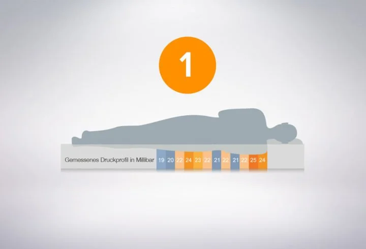 Im ersten Schritt zeigt Ihnen der Liege-Simulator, wie Ihr Körper auf der Matratze aufliegt. Dabei wird genau erfasst, wo Druckpunkte entstehen und welche Bereiche besonders entlastet oder gestützt werden sollten.